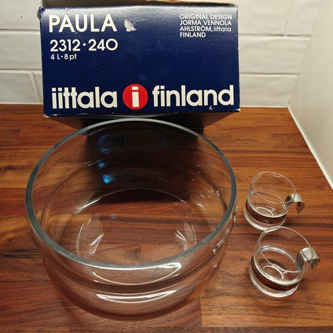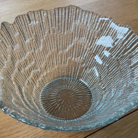 Iittala lasikulho kirkasta lasia. Kulhon halkaisija on noin 23 cm ja korkeus noin 12 cm.