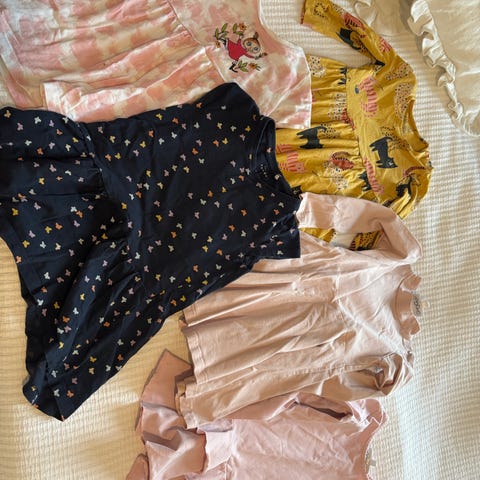 Myydään pieni vaatepaketti. Paidat 3kpl kokoa 92 (Lindex, H&M, Molo) housut 98 (Lindex).