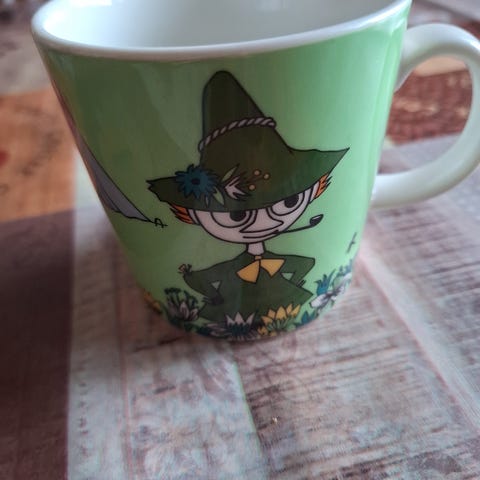 Arabia Muumi Pikku Myy muki punainen. Keraaminen muki, jossa punainen ulkopinta ja valkoinen sisäpuoli. Koristeena Muumi-hahmo Pikku Myy eri asennoissa. Muki kestää konepesun, mikroaaltouunin ja uunista pöytään käytön pohjassa olevan merkinnän mukaan. Soveltuu arki- ja kahviastiastoon sekä keräilyyn.