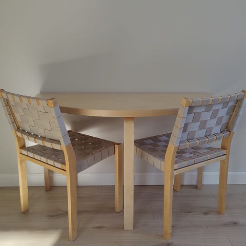 Artekin koivuinen puolipyöreä pöytä. Pöytä on hyvässä käytetyssä kunnossa.