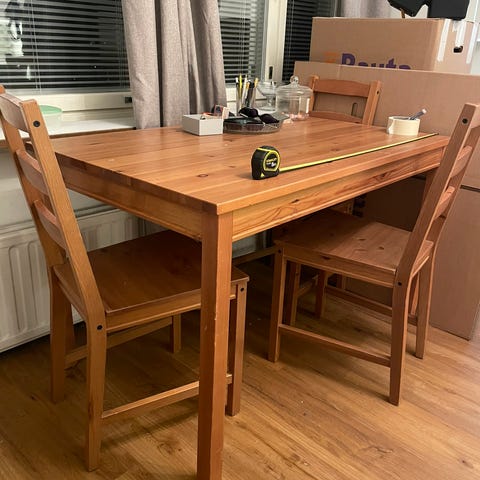 Hyvässä kunnossa oleva ikean puinen kevyt ruokapöytä ja 2 tuolia. Jalat saa irroitettua pöydästä jos on tarvetta.