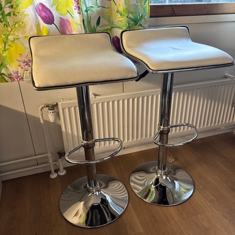 Vuosi sitten uudelleen vihreällä bukleekankaalla verhoillut baarijakkarat. Kangas siisti ja puhdas. Istuinkorkeus 65cm.