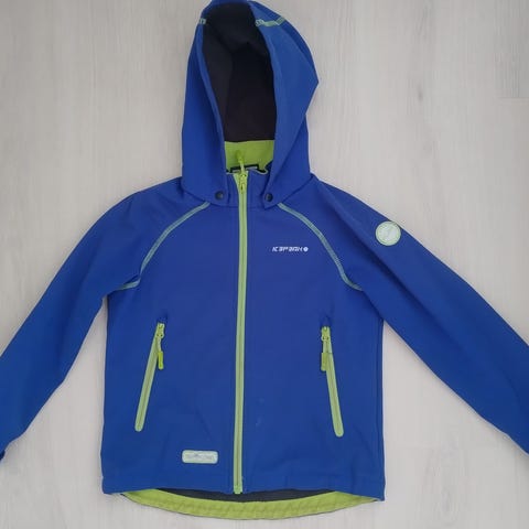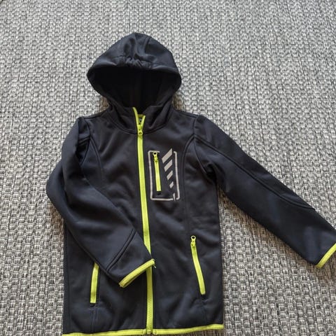 Hyväkuntoinen ja siisti musta softshelltakki koossa 122. Hihansuissa ja vyötäröllä leveä resori. Irrotettava huppu.