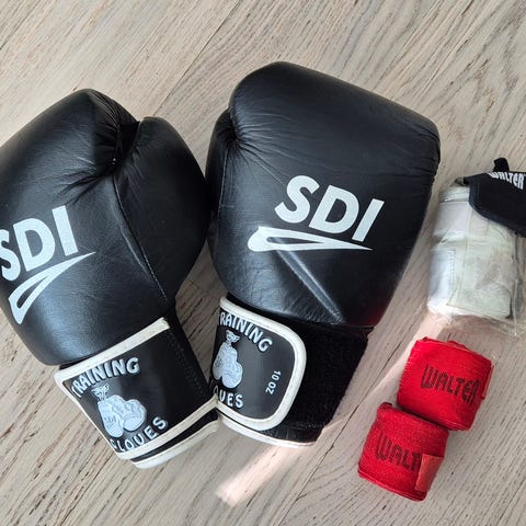 Hyvä kuntoiset nyrkkeilyhanskat ja säärisuojat myynnissä, vähän käytetty.