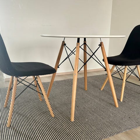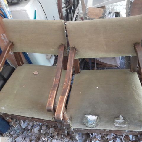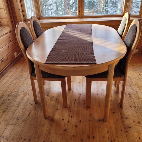 Koivua ja vaneria, valmistettu Lahdessa. Pinnat vaativat kunnostusta, mutta liitokset lujat; tukeva ja kevyt