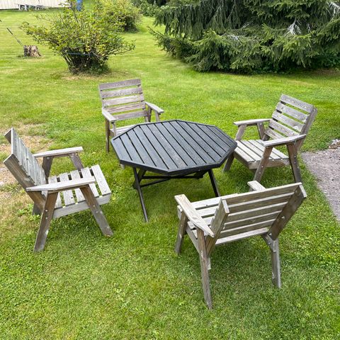 Hyväkuntoinen terassikalusto. Kuusi tuolia ja iso pöytä + aurinkovarjo.