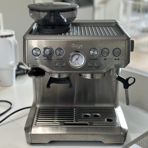 Hyväkuntoinen Sage the Bambino espressokeitin kuvan varusteilla.