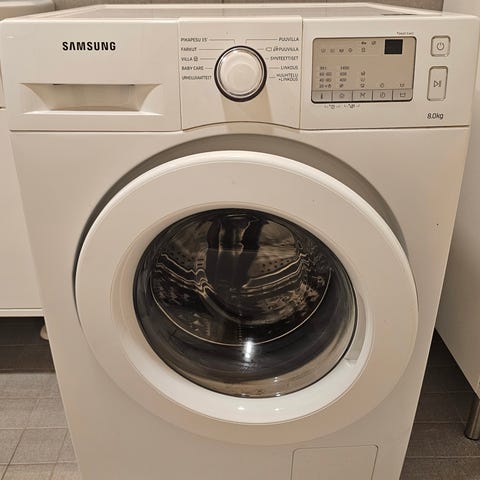 7 kg:n päältä täytettävä pesukone. Pesu ja linkous toimii, kolisee lingotessa.