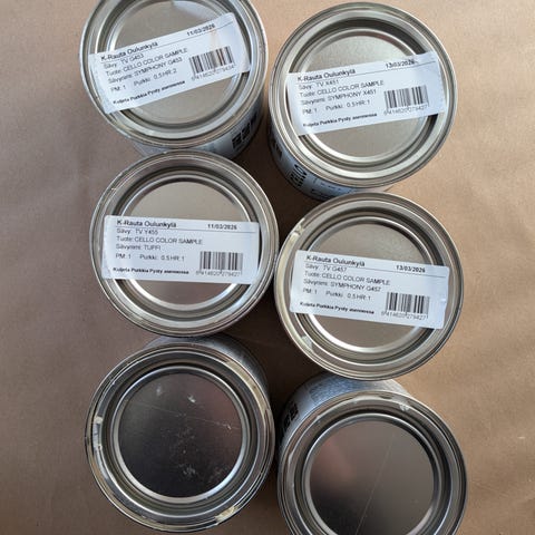 Valkoinen, Tixomatt 10l maali. Omaan silmään ainakin näyttää avaamattomalta, vuosia lämpimässä varastossa säilytetty.