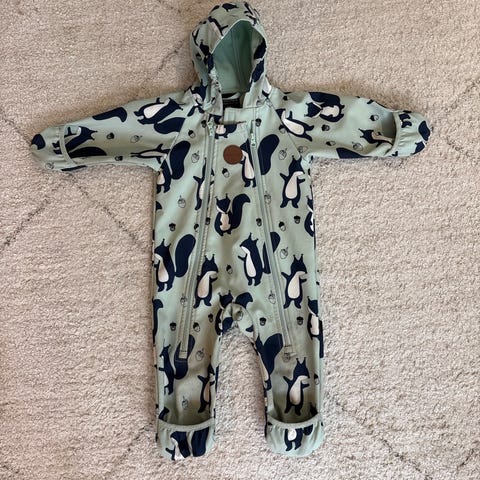 Vahvikkeet polvissa ja pepussa ovat hyvässä kunnossa. Me ollaan tykätty tästä mallista tosi paljon, hyvät säätömahdollisuudet ja kestävyys pienen lapsen konttailuun ja rymyämiseen. Käytetty jo muutamalla lapsella, joten hihan- ja lahkeensuut jonkin verran kuluneet ja heijastimissa myös kulumaa, muutakin pientä käytön jälkeä varmasti löytyy esim. kauluksessa. Kuitenkin vielä ehjä ja hyvä esimerkiksi päiväkotiin. Huomasin hupun sisäosassa jonkin valkean pistetahran, joka ei lähtenyt pesussa tai kevyesti rapsuttamalla pois, näkyy viimeisessä kuvassa (näyttää maalilta tms., ei siis hometta). Pesty ohjeen mukaisesti ennen myyntiä.