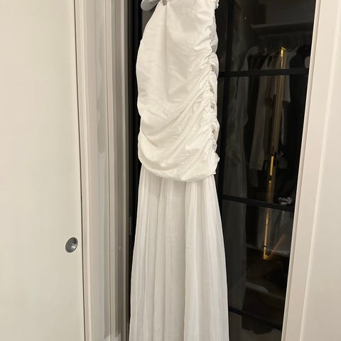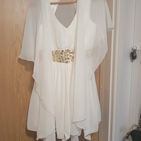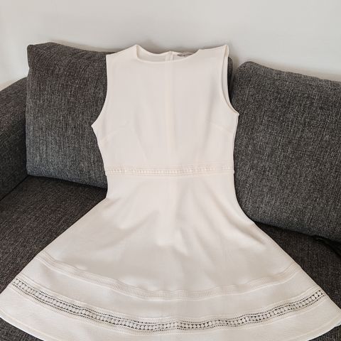 Kerran pidetty kaunis valkoinen mekko,mustat yksityiskohdat,helmassa tylliä,kapeat olkaimet,koko mielestäni M vaikka lapussa large