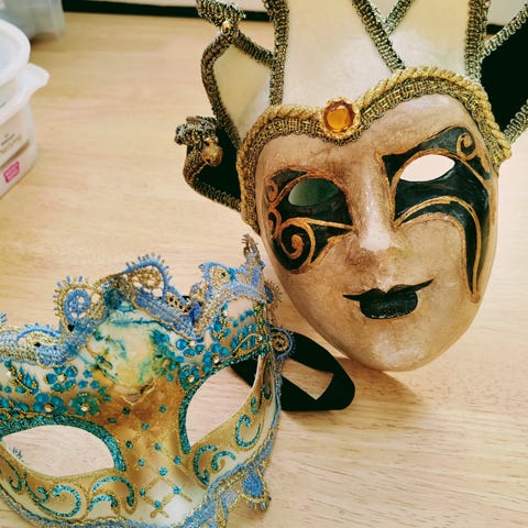 Naamiossa on punaisia höyheniä, kultaisia ja punaisia koristekuvioita sekä keskellä punainen korukivi. Nauhat kiinnitystä varten. Sopii esimerkiksi koristeeksi, naamiais- tai juhlakäyttöön aikuisille ja nuorille. Hinta 40 euroa.