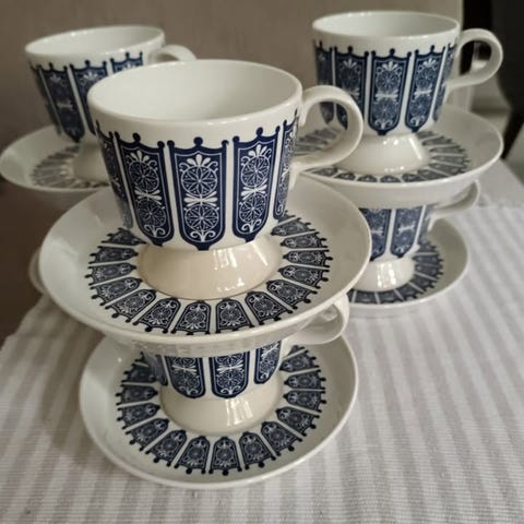 Astiat ovat vaaleaa keramiikkaa, joissa on tummansininen ja ruskea raita.
