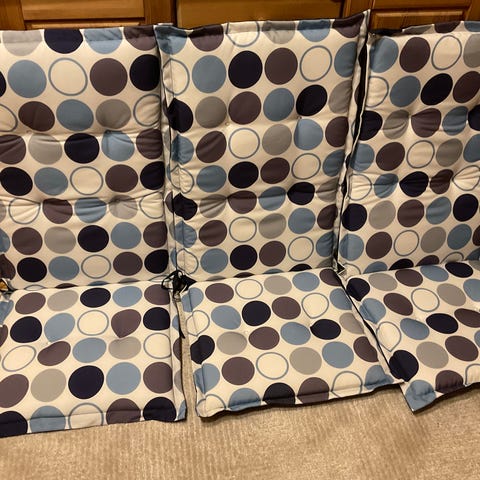 Tuolityyny, jossa korkea selkänoja ja pehmustettu istuinosa. Pääväri on valkoinen, ja kuosissa on harmaita kukkia, tekstiä. Sopii esimerkiksi ruokapöydän tai lepotuolin pehmusteeksi sisä- tai katettuihin ulkotiloihin. Tyyny on tikattu useaan osaan, mikä auttaa pehmusteen pysymistä paikallaan käytössä.