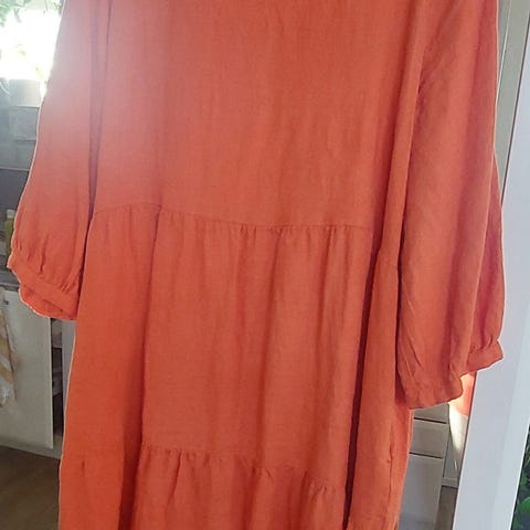 pellava. Mekko on vaaleanpunainen ja siinä on väljä, kerroksellinen leikkaus. Lyhyet hihat ja pyöreä pääntie, jossa takana nauhakiinnitys. Sopii arkeen ja vapaa-aikaan lämpimällä säällä.