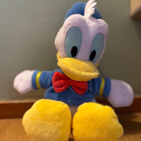 Disney Daisy Duck / Ines Ankka pehmolelu. Ollut hyllyllä, nyt pesty myyntiä varten. 30cm viivoitin vieressä.