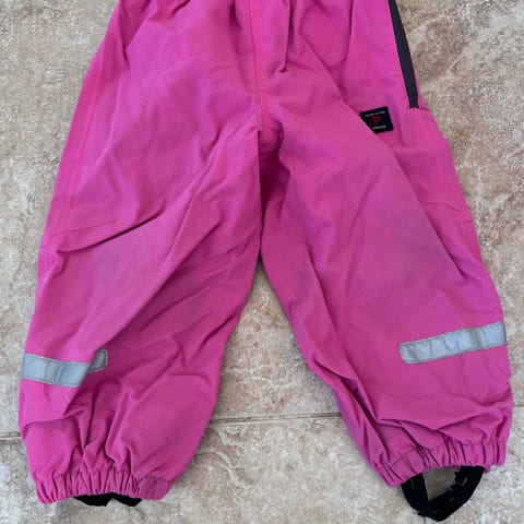 Haalarissa on kaksi vetoketjua, joista violetti toimii alas vetäessä nahkeasti. Vaaleanpunainen toimii moitteetta. Irrotettava huppu. Jalkalenkit puuttuu, napit tallella. Ei pidä enää tihkusadetta kuin hupun osalta.