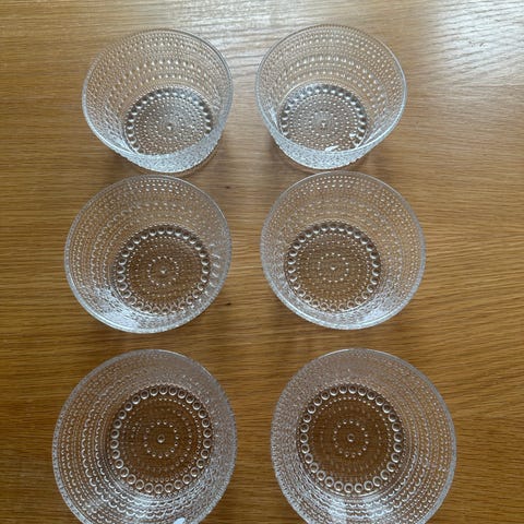 Iittala Kastehelmi jalalliset lasikulhot. Kaksi kulhoa, värit vihreä ja sininen. Kulhot ovat kirkasta värilasia, koristeellisella pisara- ja reunakuviolla. Sopivat esimerkiksi jälkiruoka- tai tarjoilukulhoiksi sekä sisustusesineiksi.Hinta yhteensä 60e ja erikseen. 35ekpl
