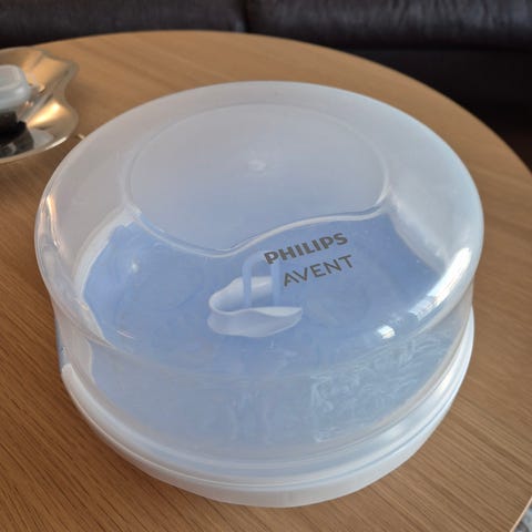 Philips Avent tuttipullojen mikroaaltosterilointilaite. Muovinen sterilointirasia, joka on tarkoitettu käytettäväksi mikroaaltouunissa vauvan tuttipullojen ja tarvikkeiden desinfiointiin. Soveltuu useille tuttipulloille ja pienille tarvikkeille, kuten tutteille ja rintapumpun osille. Käytetty hyvä kunto