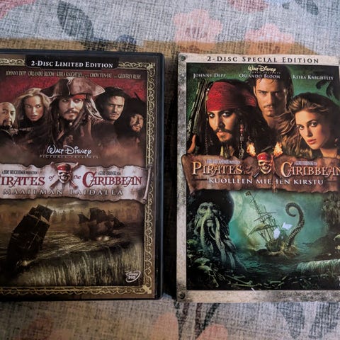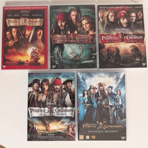 Kolme ensimmäistä Pirates of the Caribbean-elokuvaa DVD:llä. Suomenkieliset tekstit.
