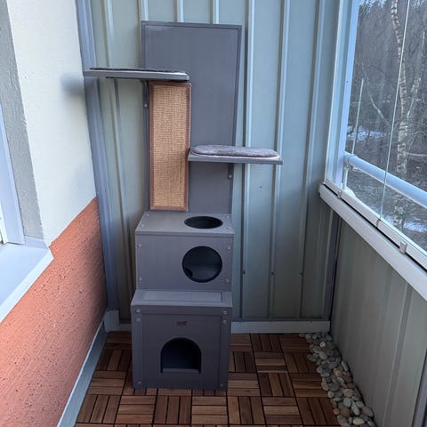 Puinen ulkokissatarha, jossa useampitasoinen rakenne ja metalliverkko sivuilla. Soveltuu kissojen ulkoiluun suojatussa tilassa esimerkiksi parvekkeella tai pihalla. Rakenteessa on pystypuita, tukipuita ja verkotetut seinät, jotka estävät eläinten karkaamisen. Tarha voidaan sijoittaa seinän viereen ja se tarjoaa kiipeily- ja tarkkailupaikkoja kissoille.