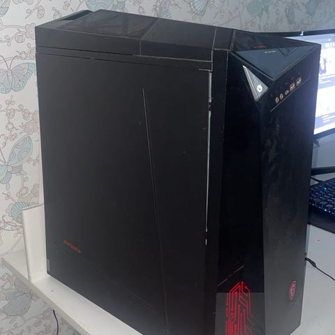 MSI pöytätietokone / pelikone mustassa kotelossa. Kotelossa on etupaneelissa kaksi tuuletinta, joissa on RGB-valaistus, sekä sivupaneelissa läpinäkyvä ikkuna. Yläpaneelissa on virtapainike, USB-liittimet ja ääniliitännät. Mukaan tulee erillinen Asus-langattoman verkon antenni.