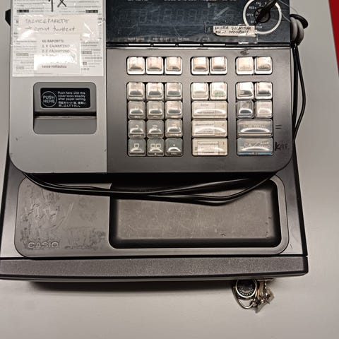 Sam4s kassakone musta. Laitteessa on numeronäppäimistö, värilliset toimintanäppäimet, sisäänrakennettu kuittitulostin ja näyttö, josta näkyvät aika ja myyntitiedot. Mukana avaimet lukitusta varten. Soveltuu myyntitapahtumien rekisteröintiin ja kuittien tulostamiseen esimerkiksi liikkeissä ja kahviloissa.