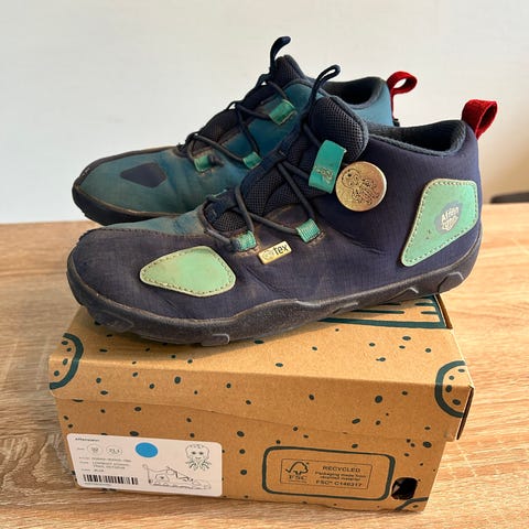 Affenzahn lasten (välikausi)kengät, koko 34. Kengissä nauhat ja tarrakiinnitys varmistamassa istuvuuden. Varren korkeus nilkan yli antaa lisätukea. Väri ruskea. Pohjassa karkea kuviointi, joka parantaa pitoa. Tarrat pitävät edelleen. Yhdellä lapsella olleet.