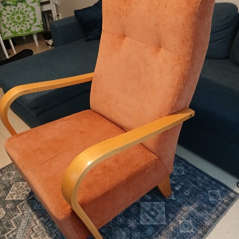 Myydään hyväkuntoinen pirteä nojatuoli. Verhoilu siistiä oranssinpunaista nupukkia.