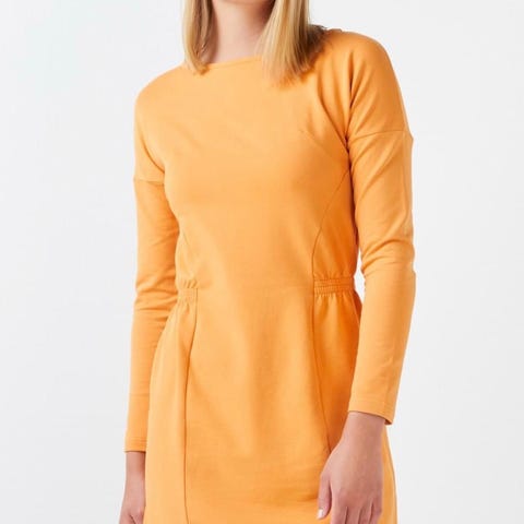 Nosh arkimekko, koko M. Materiaalina puuvilla. Mekko on oranssi ja siinä on pitkät hihat. Vyötäröllä on kevyesti poimutettu kuminauhavyötärö. Soveltuu arkipukeutumiseen. Polvimittainen.