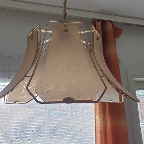 Kaunis kattovalaisin Tampellassa, valkoista täplikästä lasia ja kirkkaat lasi”hapsut” koristeena, messingin värinen ripustin. Halkaisija 24,5cm. Pistoke.
