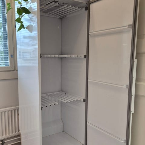 Ruotsissa valmistettu vapaasti seisova valkoinen kuivauskaappi, jossa useita ritilähyllyjä vaatteiden, kenkien tai varusteiden kuivaamiseen. Kuivauskaappi on tarkoitettu sisäkäyttöön. Soveltuu erinomaisesti kodin, mökin tai työtilan pyykin ja ulkoiluvarusteiden kuivaamiseen. Ovitiiviste alareunasta hieman auki mutta ei haittaa laitteen toimimista tai varusteiden ja vaatteiden kuivumista.