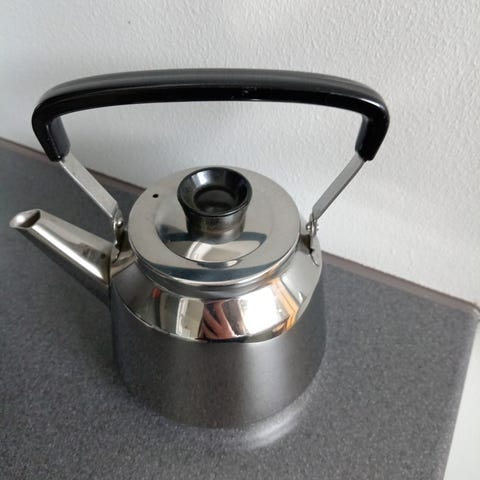 El-Rod teräksinen kahvipannu vuodelta 1956, tilavuus 2,5 litraa. Ikäisekseen erittäin siistikuntoinen, ainoastaan nupissa pientä halkeamaa, joka ei kuitenkaan haittaa käyttöä. Kannen reunassa myös hienoista lommoa (ks. kuva).
