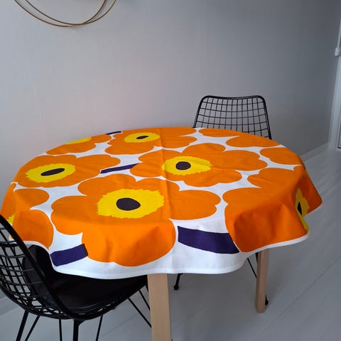Marimekko oranssi Pieni Unikko akryylipinnoitettu puuvillakangas. Uusi, käyttämätön. Lievä virhe painatuksessa, katso viimeinen kuva. Pituus 1,66 m. Vastaava määrä ykköslaatua maksaa 97 e.