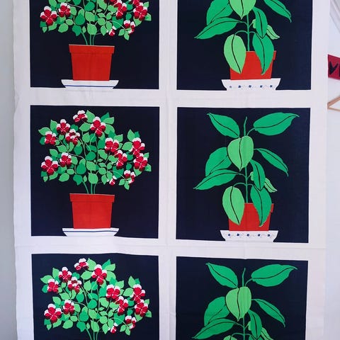Paljon vintage ja retro kankaita, verhoja, pöytäliinoja jne tekstiilejä myynnissä.
