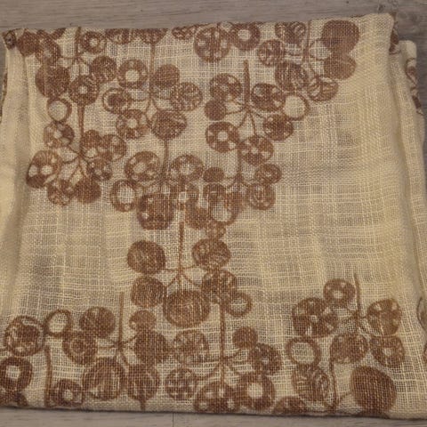 1970-1980 luvun raikkaat puuvillaverhot, joissa väreinä toistuvat punainen, musta ja valkoinen. Kaarimaiset kuviot.