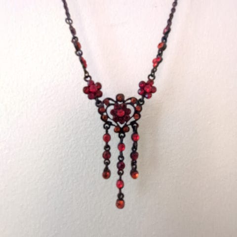 Koristeellinen kaulakoru, jossa kirkkaita koristekiviä.