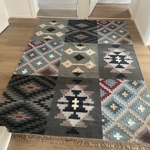 Modern Dhurry villamatto on kevyt ja käsinkudottu iso matto 160 x 230 cm. Matto on molemmin puolin pidettävä.