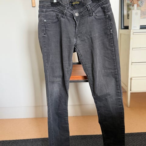Catch farkut, harmaa denim. Koko naisten S, vyötärökoko W36. Materiaalina denim. Perinteinen viisitaskuinen malli, vetoketju- ja nappikiinnitys edessä. Sopivat arkipukeutumiseen ja yhdisteltäväksi erilaisten yläosien kanssa. Se on 95 cm pitkä. Siinä on matala vyötärö ja kapea istuvuus. Polvet ja lahkeensuut ovat revityt. Denim-kangas on erittäin laadukasta.