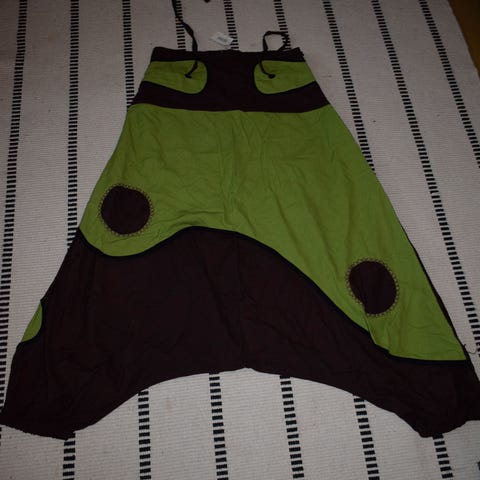 Uudet haaremihousut kesän rientoihin. Kuvissa näkyvän mittanauhan avulla näet housujen koon. Nämä ovat siis kapeavyötäröiselle tai lapselle sopivat... Merkkilappu on Aurinkoa verkkokaupan aikaansaannos ja materiaalina puuvilla.