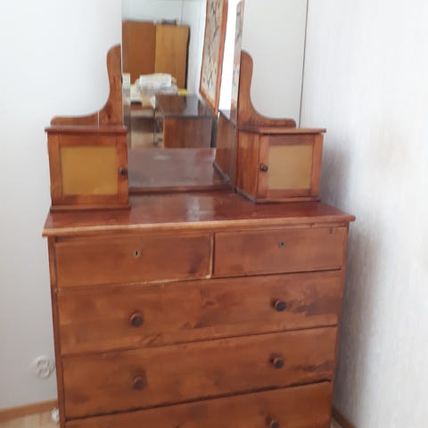 Peilin kanssa korkeus 1.74 m. Leveys. 1,24 m. Syvyys 45.5 cm. Korkeus pöytä tasolla, ilman peiliä 80cm