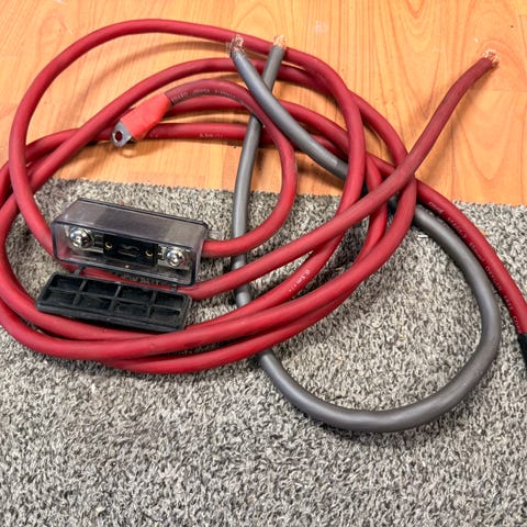 Four Connect OFC 10mm2 virtakaapelia jotain 7metriä ja maadoitus 0,4metriä.Suojaputki paikoillaan ja kaapelin läpivienti rintapellistä.Sulakepesä MDS agu-lasiputki ja 40amp sulake.M8 rengas liittimet virta ja maassa sekä kaapeliholkit kaapeleissa.Vastaavat uudet 60eur.