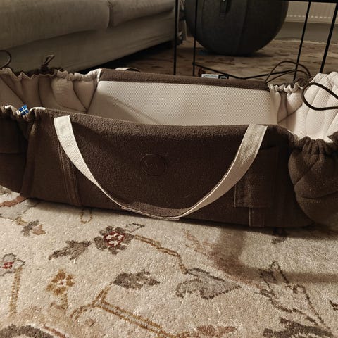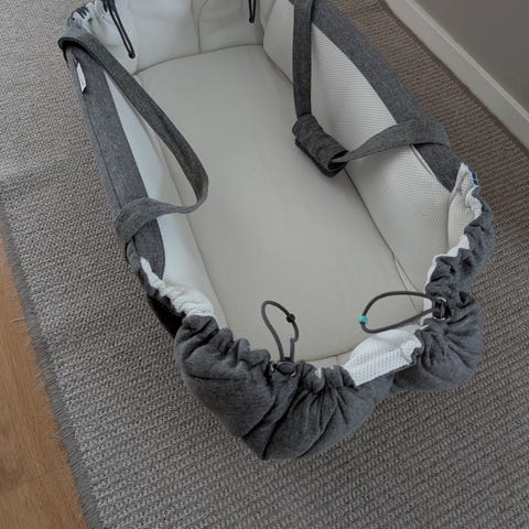 Myydään Najell-vauvapesä erinomaisessa kunnossa (ei käytön jälkiä, lukuun ottamatta hyvin vähäistä, tuskin näkyvää nukkaantumista kankaassa). Käytössä ollessaan kantolaukun tapaan olkapäällä. Käytettynä se levittyy tasaiseksi alustaksi.