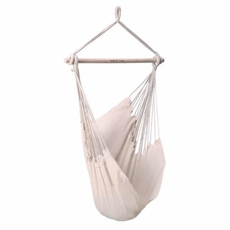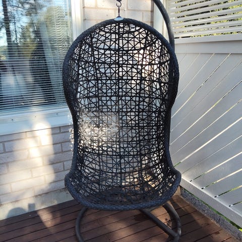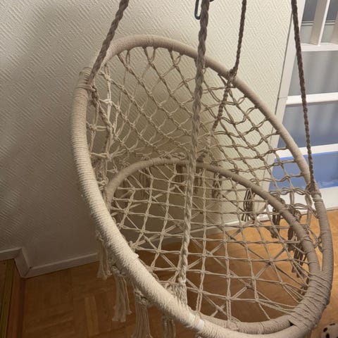 Hyväkuntoinen riipputuoli. Mukaan tulee kaksi tyynyä sekä lisäksi saa köyden josta tuoli roikkunut.