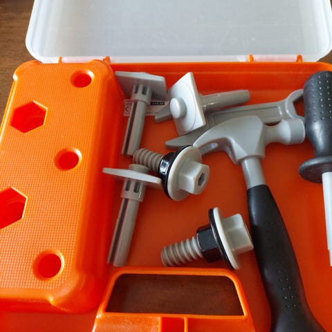 IKEA pehmoinen työkalusetti lapsille. Settiin kuuluu kangaskori sekä useita pehmeitä työkaluja, kuten mitta, vasara, saha, pora ja ruuvimeisselit sekä pehmeät palikat. Materiaali on pehmeää kangasta, joka sopii leikkeihin pienille lapsille. Soveltuu roolileikkeihin ja motoristen taitojen harjoitteluun sisätiloissa. Pora toimii huonosti, muuten hyvässä kunnossa.