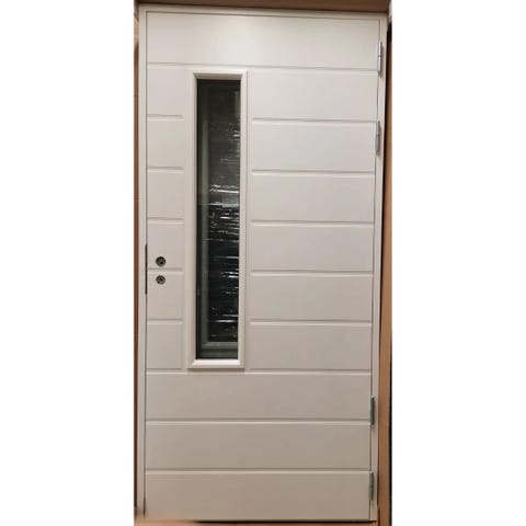 Ovi on moderni ja pelkistetty, ja se sopii täydellisesti esimerkiksi hirsitaloon tai skandinaaviseen kotiin.