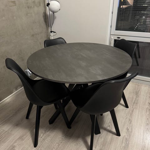 Ikeasta ostetut ruokapöytä ja 4 tuolia. Pöydän mallia en enää muista, mutta tukevaa mallia. Tuolit on Ikean Rosentorp. Istuinpehmusteet saa mukaan. Normaaleja käytön jälkiä/kulumia, mutta yleisilme siisti.