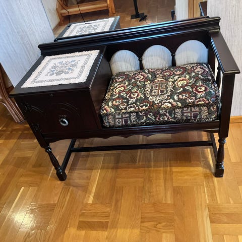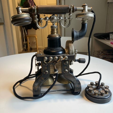 LM Ericsson & Co seinäpuhelin. Puinen runko, jossa lakattu pinta ja koristeellinen LM Ericsson & Co Stockholm -logo. Puhelimessa on messinkisiä yksityiskohtia, kuten kuuloke- ja mikrofoniosat sekä metallinen numerolevy. Puhelin on suunniteltu seinäkiinnitykseen. Sopii esimerkiksi sisustuselementiksi tai keräilyesineeksi vanhoista puhelimista kiinnostuneille.