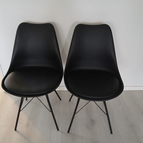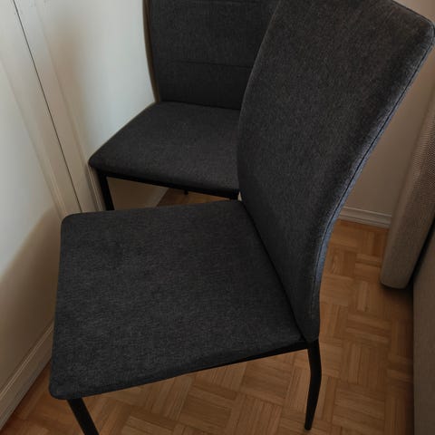 Mustat perus tuolit, ei ole tullut käyttöä. Muuten hyvässä kunnossa tuolien puuosat on vähän tummunut.