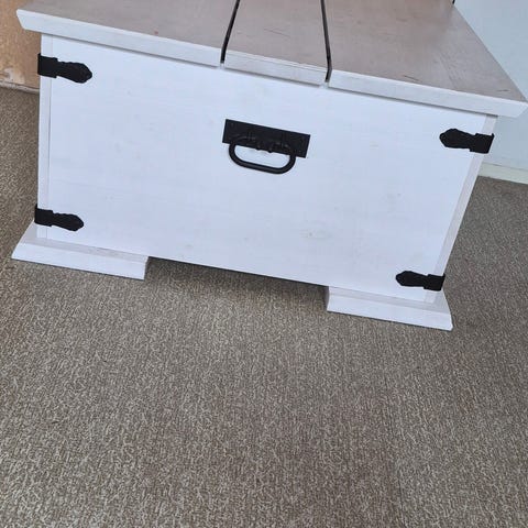 Ehjä, käytönjälkeä löytyy, kirstun kannesta maali hieman kulunut joten harmahtaa vähän. Ollut välillä pääosin sisällä, kesällä partsilla. Kannesta jossain kohtiin irronnut lautoja, nämä kiinnitetty viimeistelynaulaimella uudelleen.